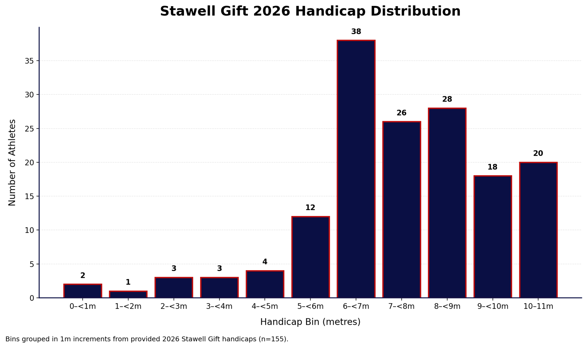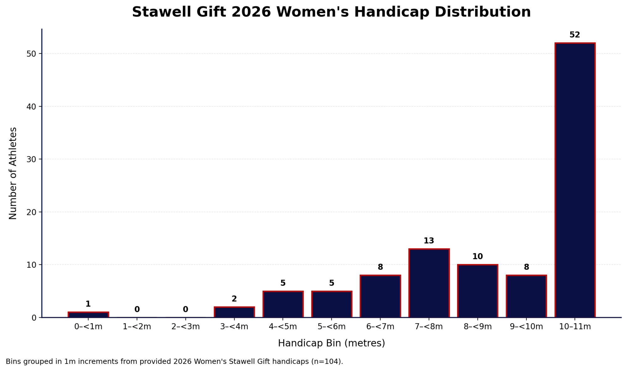 This Easter – albeit with almost all of Australia’s top athletes skipping the event to prioritise next week’s Australian Championships in Sydney – sees 9 of the 165 men line up under the 4m mark in the iconic 120m event held in the Victorian town of Stawell. Similarly the women’s Gift features 3 of 104 women off a mark of 4m or less.