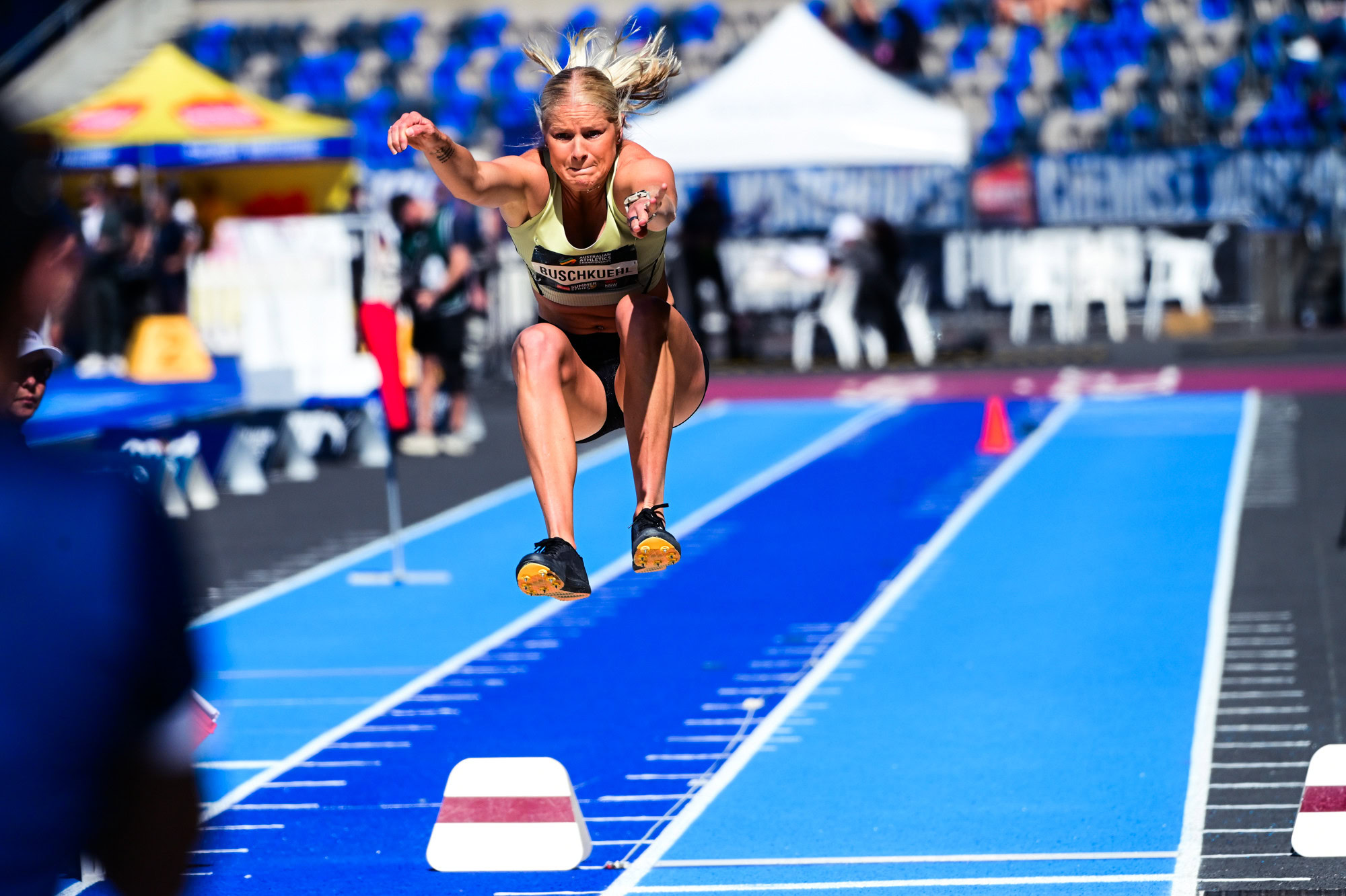 National record holder Brooke Buschkuehl showed her experience, leaping to a 2cm victory with a final round jump to defeat Delta Amidzovski. Buschkuehl jumped a season’s best 6.67m (+1.1) for her seventh career long jump title.