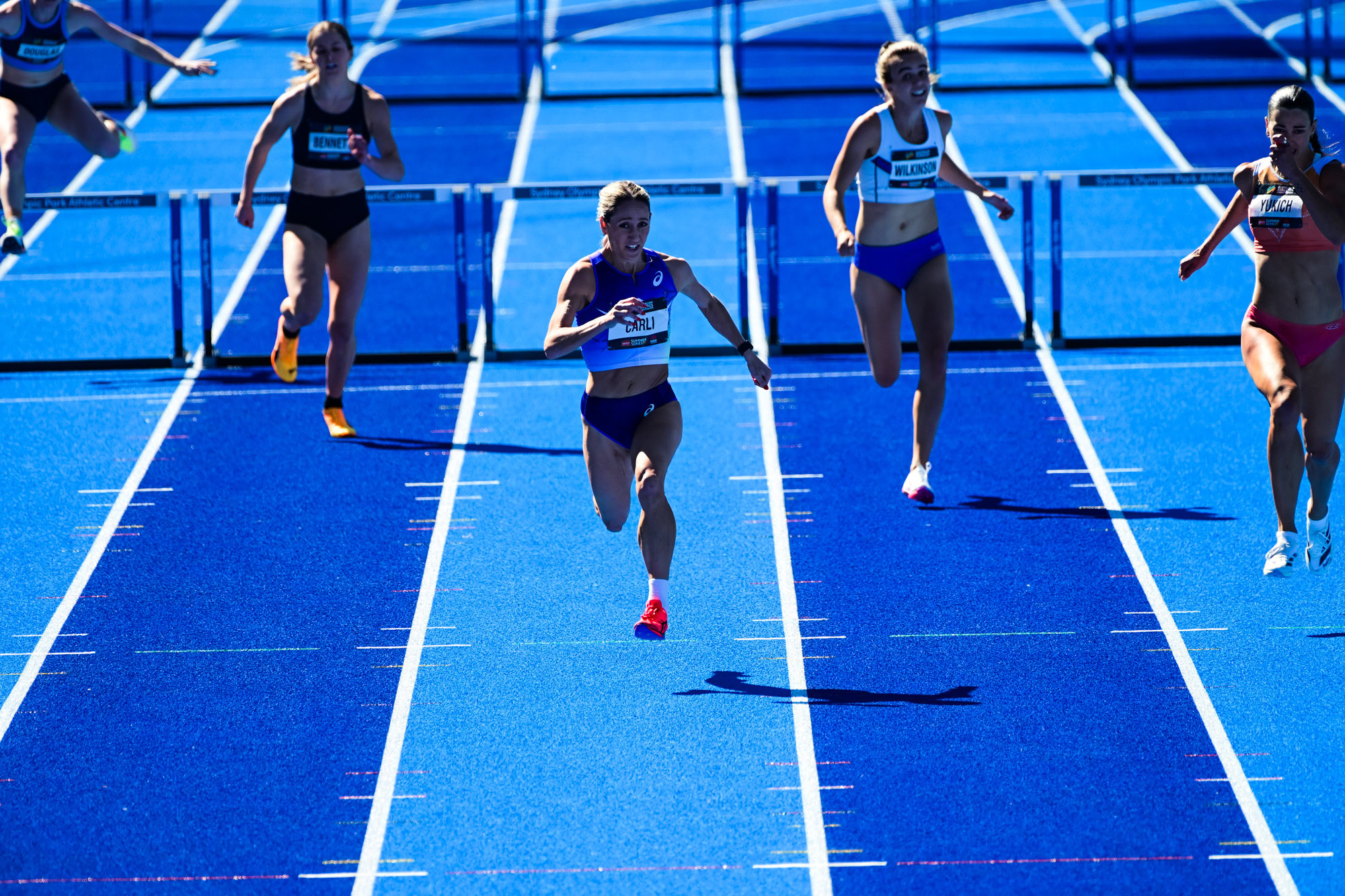 Sarah Carli maintained her composure in the 400m hurdles, challenged by Alanah Yukich, but winning by half a second in 55.21 seconds.